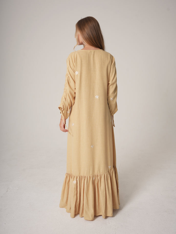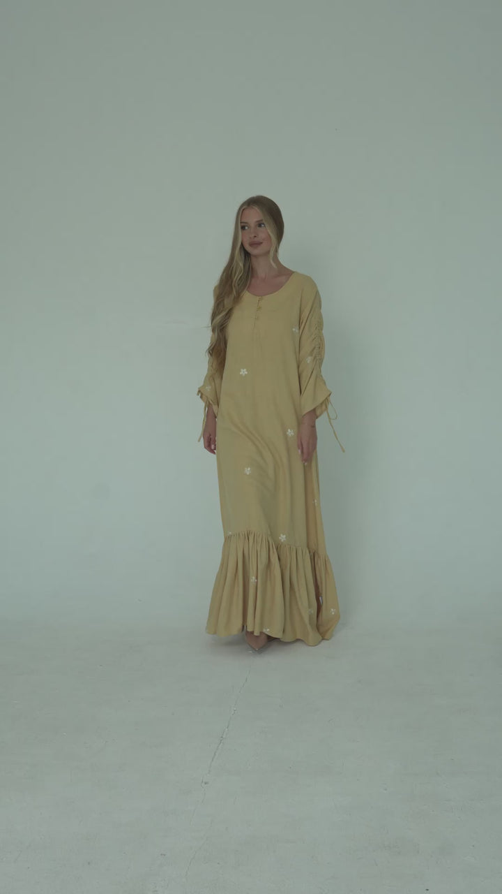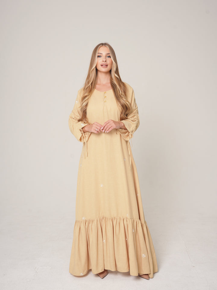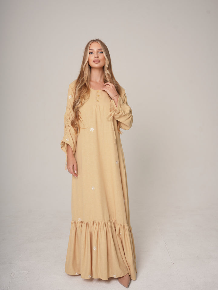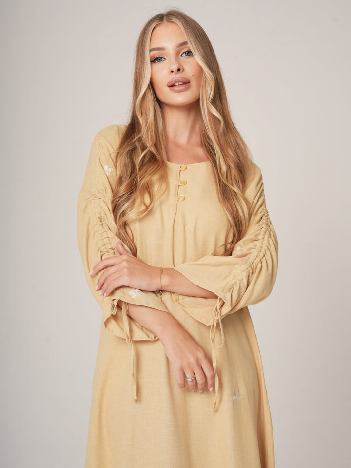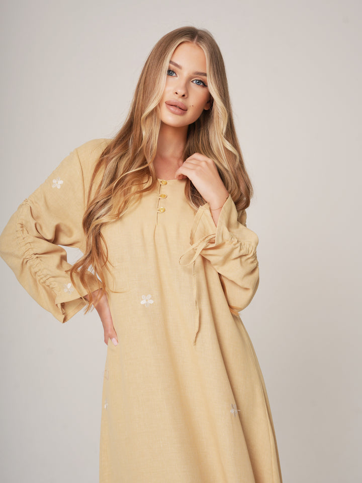 Introducing our Yellow Linen Dress – a radiant staple for daily wear and gatherings. With its charming white floral embroidery and comfy linen fabric, it's the perfect blend of style and comfort. Whether you're out and about or meeting friends, this dress ensures you'll stand out effortlessly.